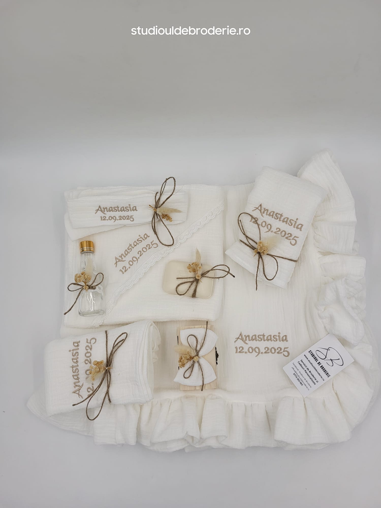 Set complet Trusou de botez din muselină personalizat prin broderie 8 piese, diverse culori